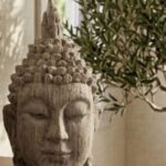 ראש בודהה מחומר דמוי עץ, בצבע חום טבעי