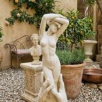פסל אבן איטלקי קלאסי המתאר אישה עירומה המוחזקת על ידי ידיים גדולות,