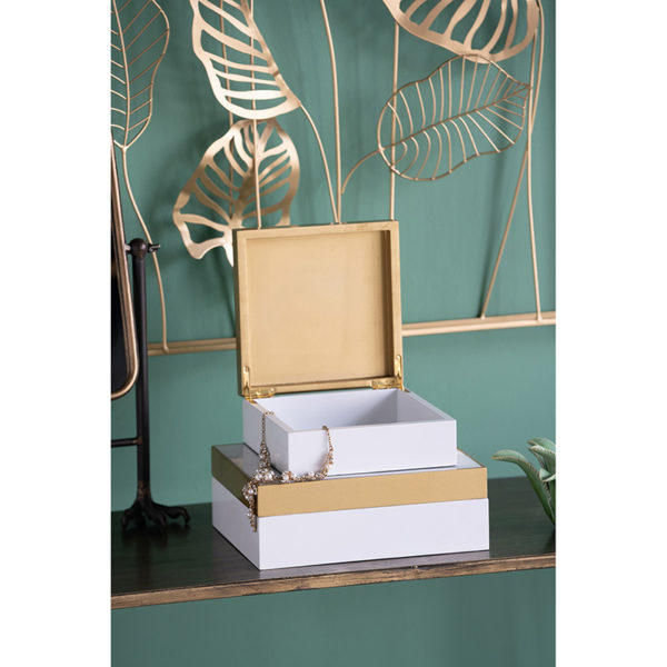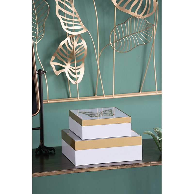 קופסא מרובעת במידות 17X17X7 ס”מ, בצבע לבן ובעיטור פרפר ושולי זהב. עשויה MDF.